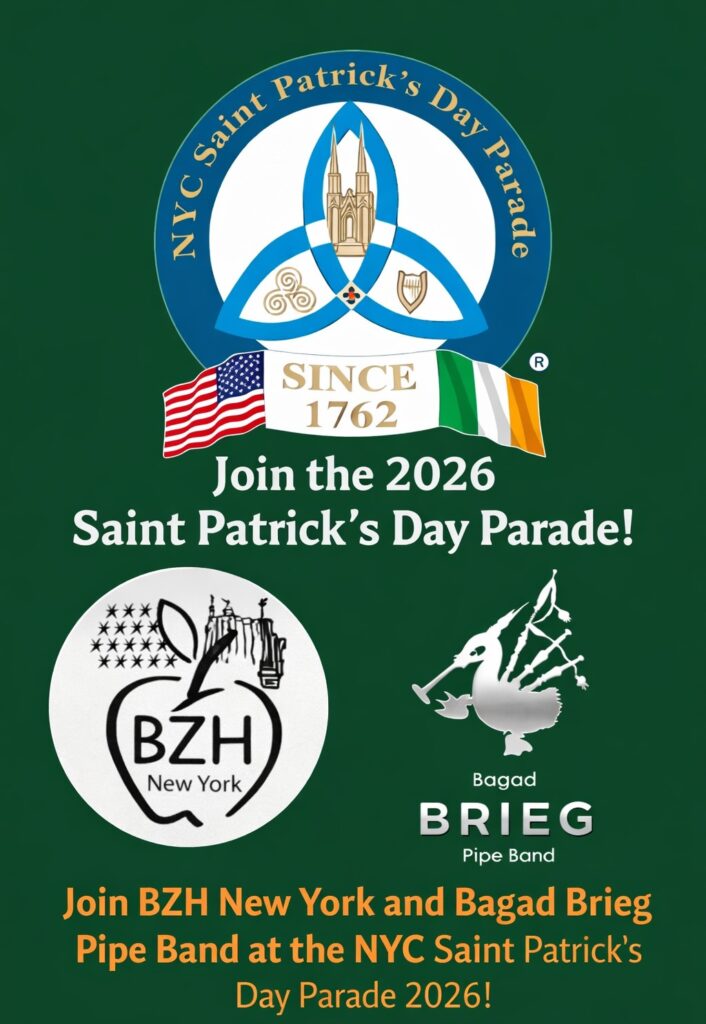 Excitement is building as we prepare to welcome Brittany’s Bagad Brieg to New York for an unforgettable performance at the iconic NYC St. Patrick’s Day Parade on March 17, 2026. This marks a historic moment for Breton culture, as the sounds of bagpipes and bombards from Brittany will resonate down Fifth Avenue, showcasing our shared Celtic heritage to the world.